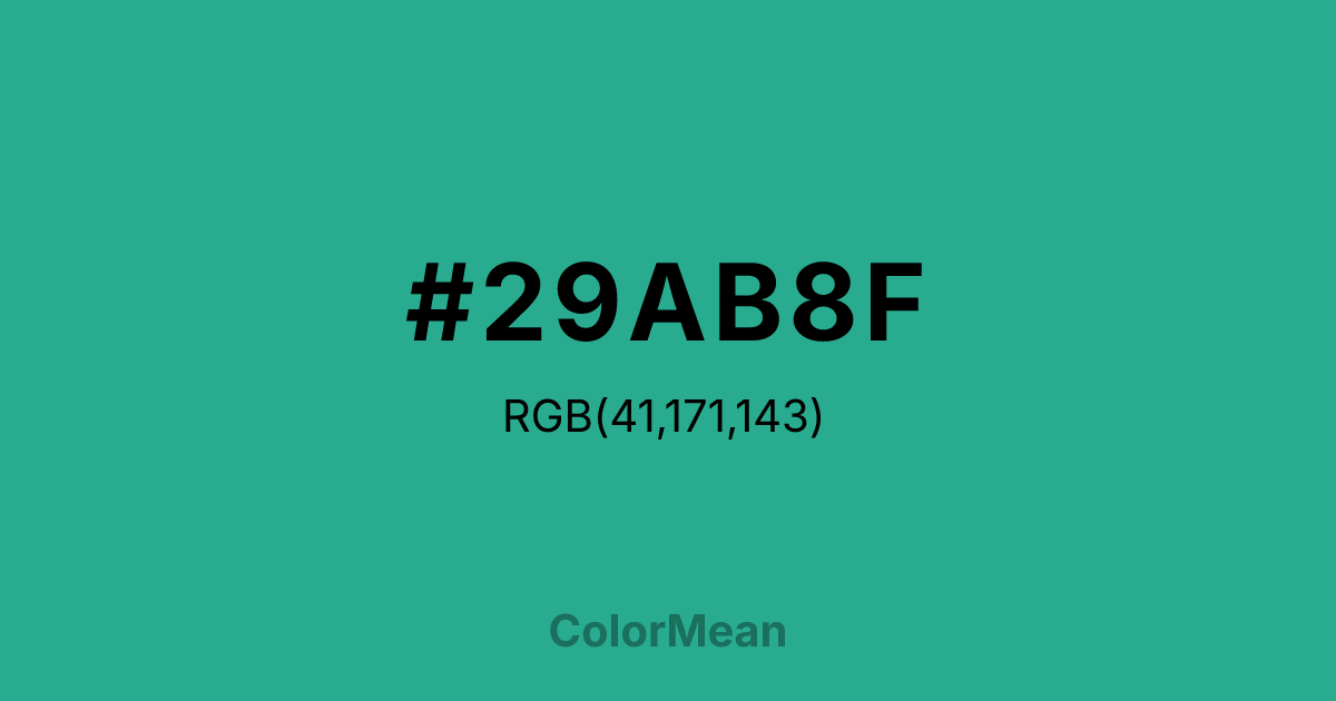 #29AB8F RGB value is (41, 171, 143). The hex color red value is 41, green is 171, and blue is 143. Its HSL format shows a hue of 167°, saturation of 61 percent, and lightness of 42 percent. The CMYK process values are 76 percent, 0 percent, 16 percent, 33 percent.