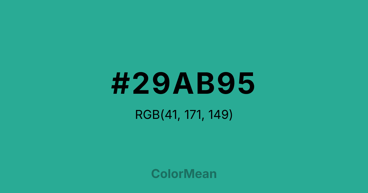 #29AB95 RGB value is (41, 171, 149). The hex color red value is 41, green is 171, and blue is 149. Its HSL format shows a hue of 170°, saturation of 61 percent, and lightness of 42 percent. The CMYK process values are 76 percent, 0 percent, 13 percent, 33 percent.
