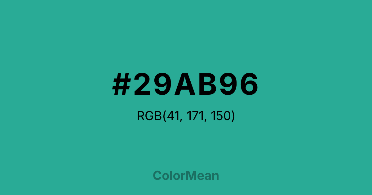 #29AB96 RGB value is (41, 171, 150). The hex color red value is 41, green is 171, and blue is 150. Its HSL format shows a hue of 170°, saturation of 61 percent, and lightness of 42 percent. The CMYK process values are 76 percent, 0 percent, 12 percent, 33 percent.
