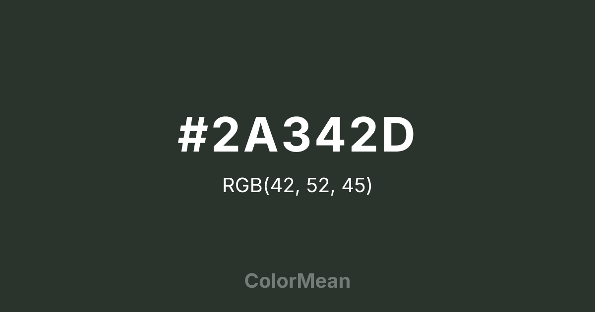 #2A342D RGB value is (42, 52, 45). The hex color red value is 42, green is 52, and blue is 45. Its HSL format shows a hue of 138°, saturation of 11 percent, and lightness of 18 percent. The CMYK process values are 19 percent, 0 percent, 13 percent, 80 percent.