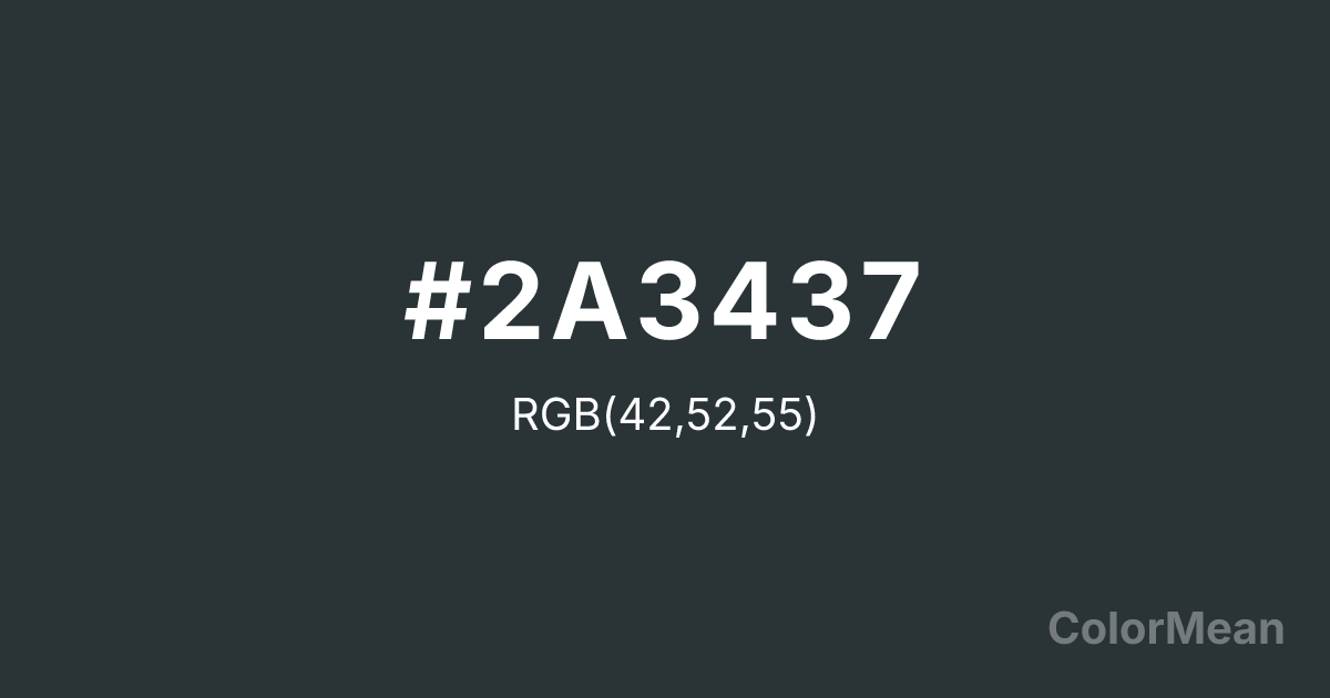 #2A3437 RGB value is (42, 52, 55). The hex color red value is 42, green is 52, and blue is 55. Its HSL format shows a hue of 194°, saturation of 13 percent, and lightness of 19 percent. The CMYK process values are 24 percent, 5 percent, 0 percent, 78 percent.