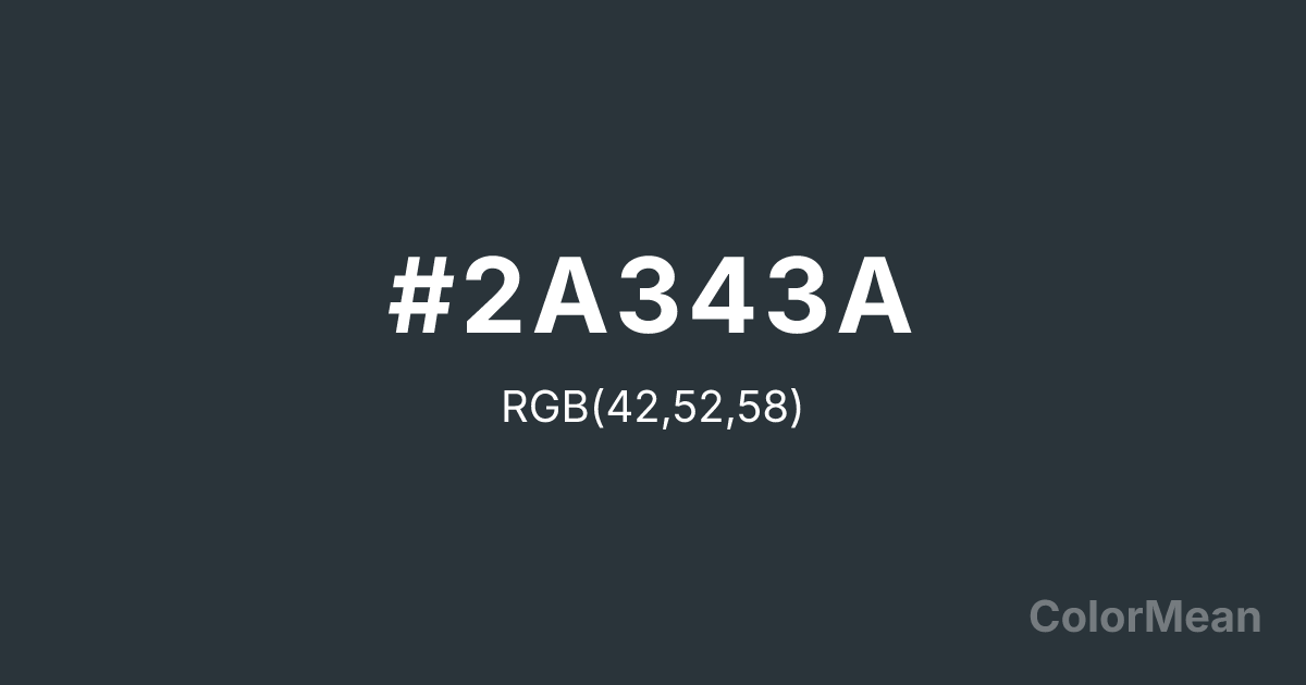 #2A343A RGB value is (42, 52, 58). The hex color red value is 42, green is 52, and blue is 58. Its HSL format shows a hue of 203°, saturation of 16 percent, and lightness of 20 percent. The CMYK process values are 28 percent, 10 percent, 0 percent, 77 percent.
