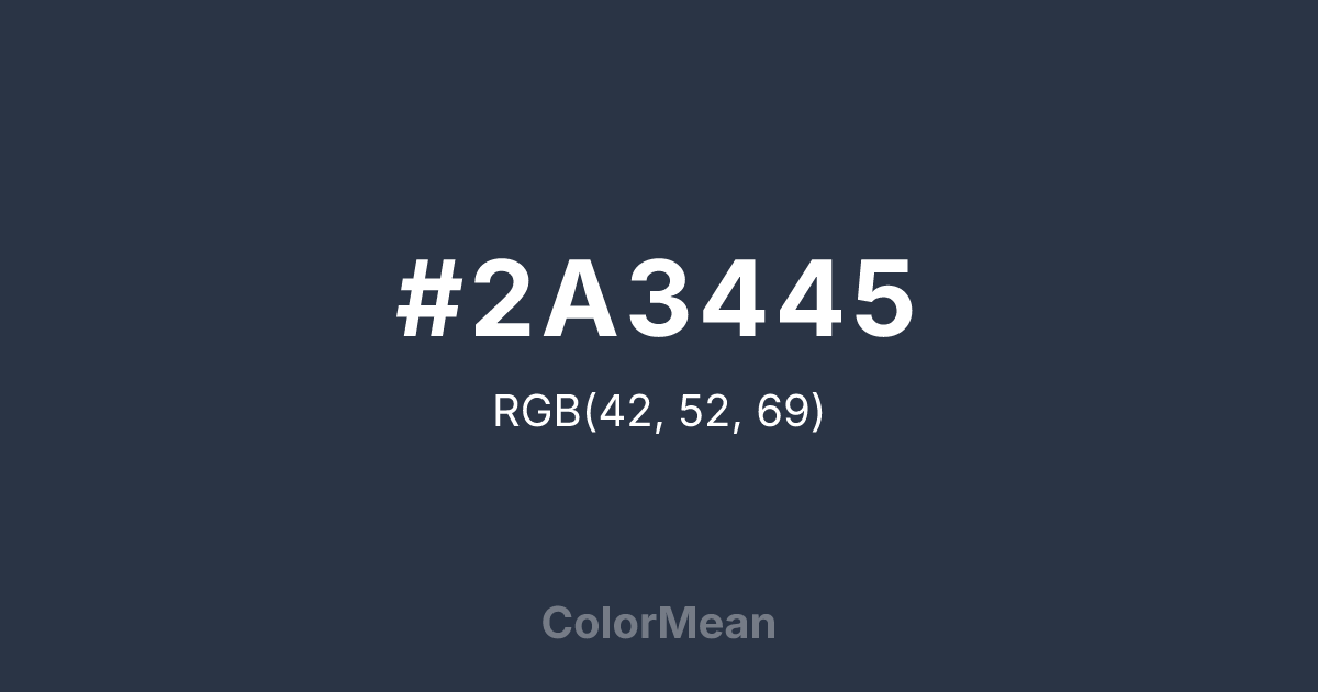 #2A3445 RGB value is (42, 52, 69). The hex color red value is 42, green is 52, and blue is 69. Its HSL format shows a hue of 218°, saturation of 24 percent, and lightness of 22 percent. The CMYK process values are 39 percent, 25 percent, 0 percent, 73 percent.