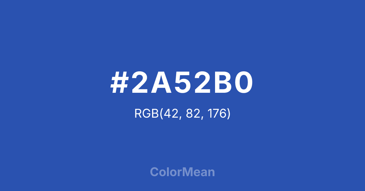 #2A52B0 RGB value is (42, 82, 176). The hex color red value is 42, green is 82, and blue is 176. Its HSL format shows a hue of 222°, saturation of 61 percent, and lightness of 43 percent. The CMYK process values are 76 percent, 53 percent, 0 percent, 31 percent.