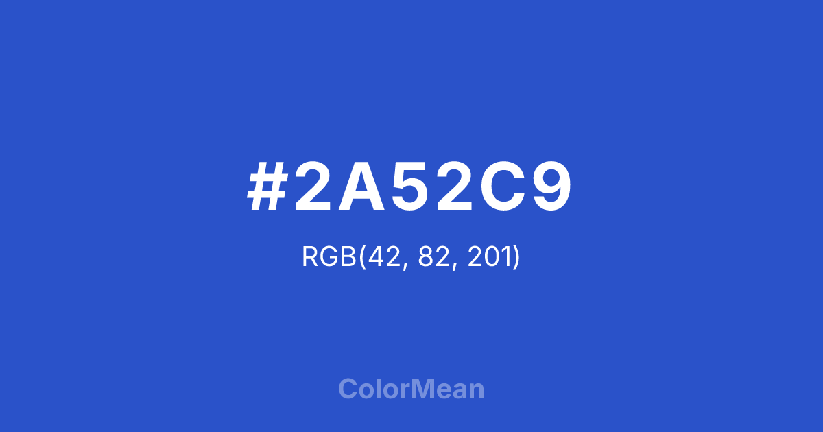 #2A52C9 RGB value is (42, 82, 201). The hex color red value is 42, green is 82, and blue is 201. Its HSL format shows a hue of 225°, saturation of 65 percent, and lightness of 48 percent. The CMYK process values are 79 percent, 59 percent, 0 percent, 21 percent.