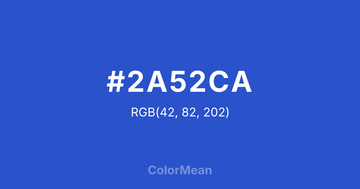 #2A52CA RGB value is (42, 82, 202). The hex color red value is 42, green is 82, and blue is 202. Its HSL format shows a hue of 225°, saturation of 66 percent, and lightness of 48 percent. The CMYK process values are 79 percent, 59 percent, 0 percent, 21 percent.