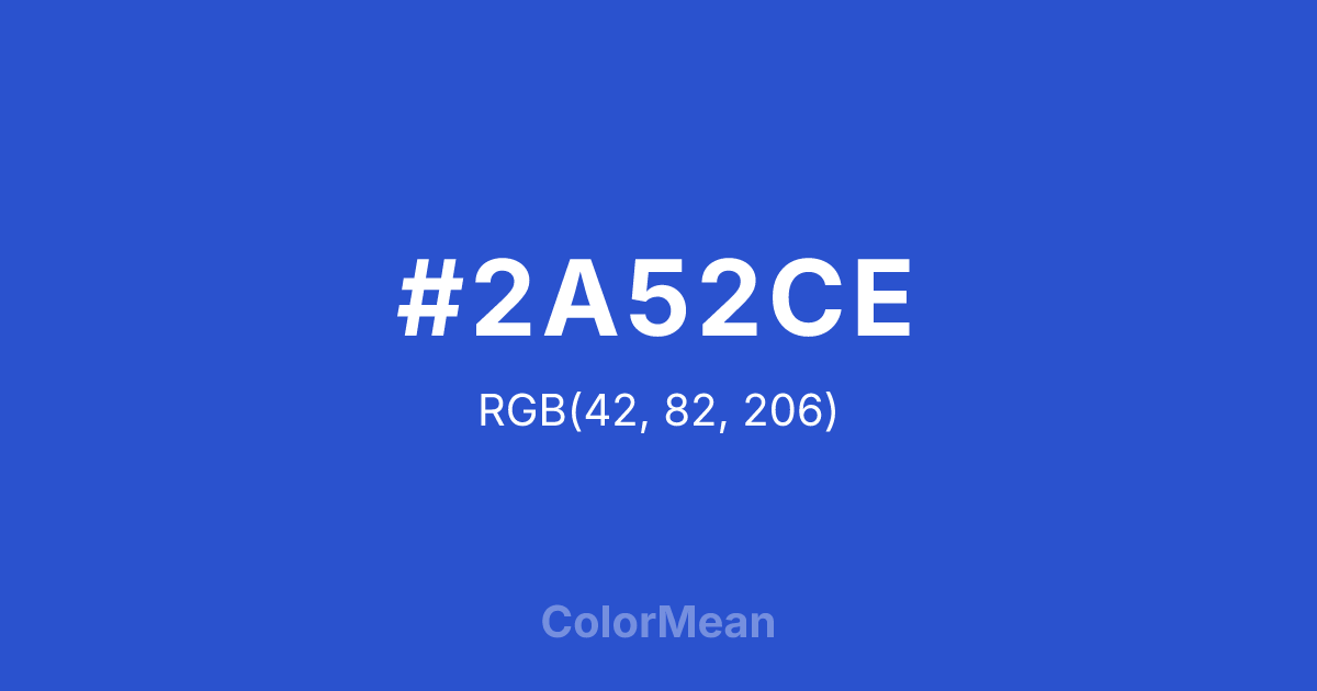 #2A52CE RGB value is (42, 82, 206). The hex color red value is 42, green is 82, and blue is 206. Its HSL format shows a hue of 225°, saturation of 66 percent, and lightness of 49 percent. The CMYK process values are 80 percent, 60 percent, 0 percent, 19 percent.