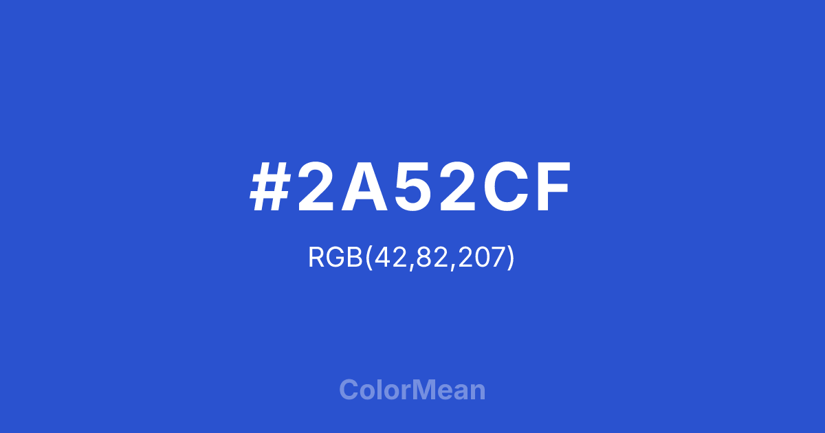 #2A52CF RGB value is (42, 82, 207). The hex color red value is 42, green is 82, and blue is 207. Its HSL format shows a hue of 225°, saturation of 66 percent, and lightness of 49 percent. The CMYK process values are 80 percent, 60 percent, 0 percent, 19 percent.