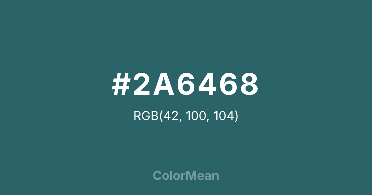 #2A6468 RGB value is (42, 100, 104). The hex color red value is 42, green is 100, and blue is 104. Its HSL format shows a hue of 184°, saturation of 42 percent, and lightness of 29 percent. The CMYK process values are 60 percent, 4 percent, 0 percent, 59 percent.