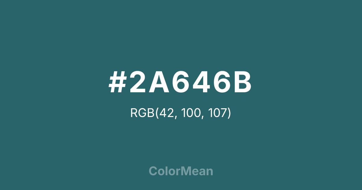 #2A646B RGB value is (42, 100, 107). The hex color red value is 42, green is 100, and blue is 107. Its HSL format shows a hue of 186°, saturation of 44 percent, and lightness of 29 percent. The CMYK process values are 61 percent, 7 percent, 0 percent, 58 percent.