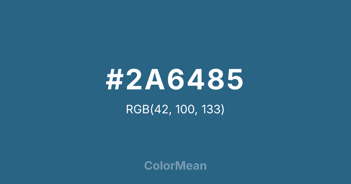 #2A6485 RGB value is (42, 100, 133). The hex color red value is 42, green is 100, and blue is 133. Its HSL format shows a hue of 202°, saturation of 52 percent, and lightness of 34 percent. The CMYK process values are 68 percent, 25 percent, 0 percent, 48 percent.