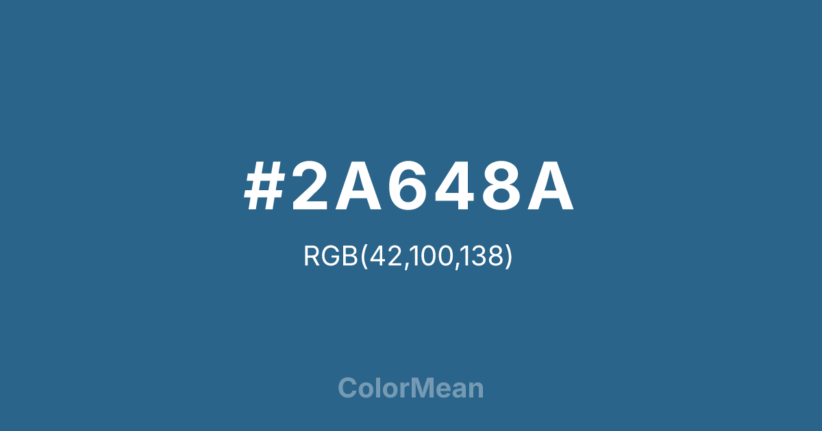 #2A648A RGB value is (42, 100, 138). The hex color red value is 42, green is 100, and blue is 138. Its HSL format shows a hue of 204°, saturation of 53 percent, and lightness of 35 percent. The CMYK process values are 70 percent, 28 percent, 0 percent, 46 percent.