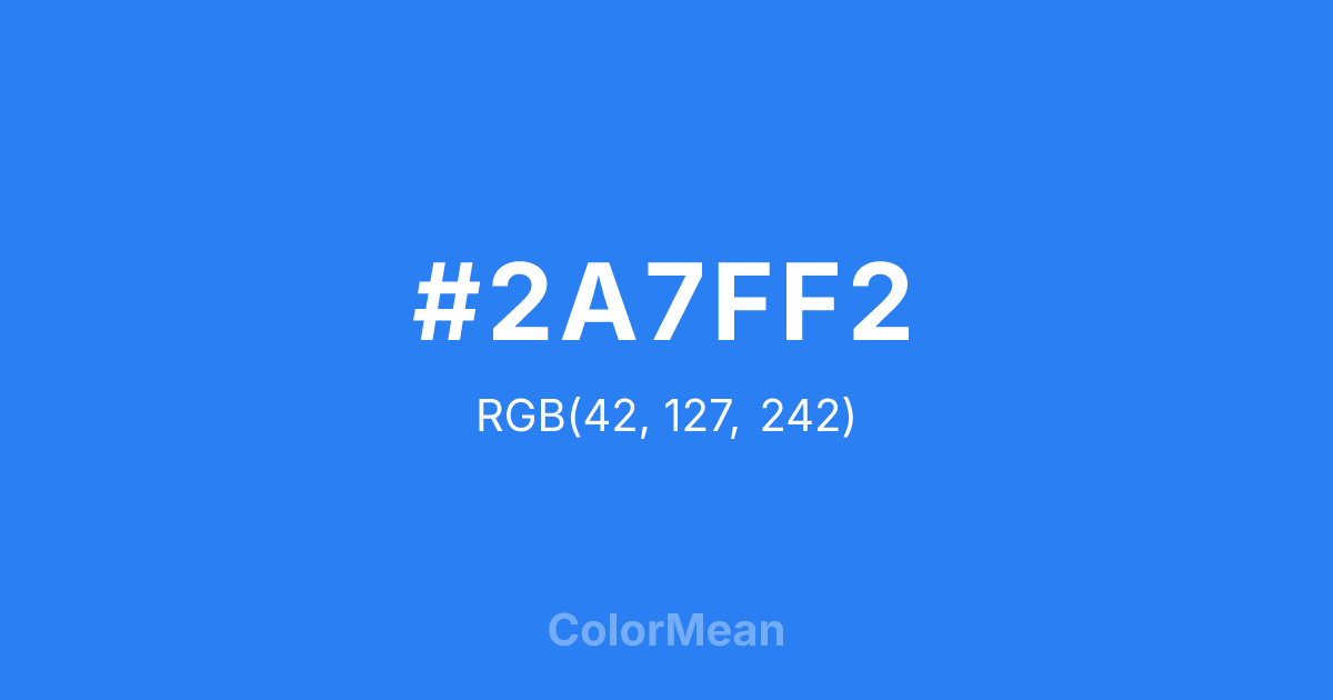 #2A7FF2 RGB value is (42, 127, 242). The hex color red value is 42, green is 127, and blue is 242. Its HSL format shows a hue of 215°, saturation of 88 percent, and lightness of 56 percent. The CMYK process values are 83 percent, 48 percent, 0 percent, 5 percent.