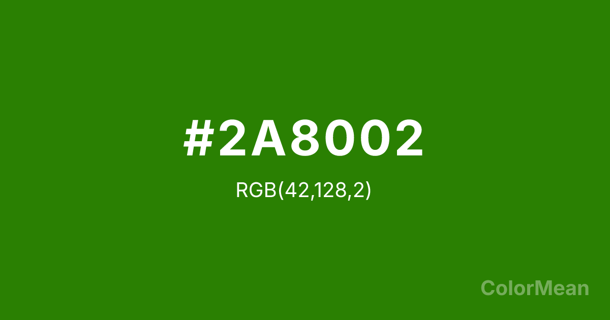 #2A8002 RGB value is (42, 128, 2). The hex color red value is 42, green is 128, and blue is 2. Its HSL format shows a hue of 101°, saturation of 97 percent, and lightness of 25 percent. The CMYK process values are 67 percent, 0 percent, 98 percent, 50 percent.