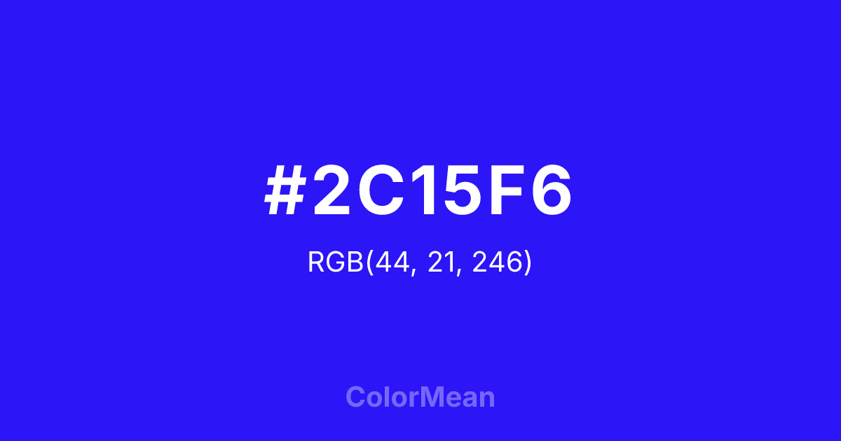 #2C15F6 RGB value is (44, 21, 246). The hex color red value is 44, green is 21, and blue is 246. Its HSL format shows a hue of 246°, saturation of 93 percent, and lightness of 52 percent. The CMYK process values are 82 percent, 91 percent, 0 percent, 4 percent.