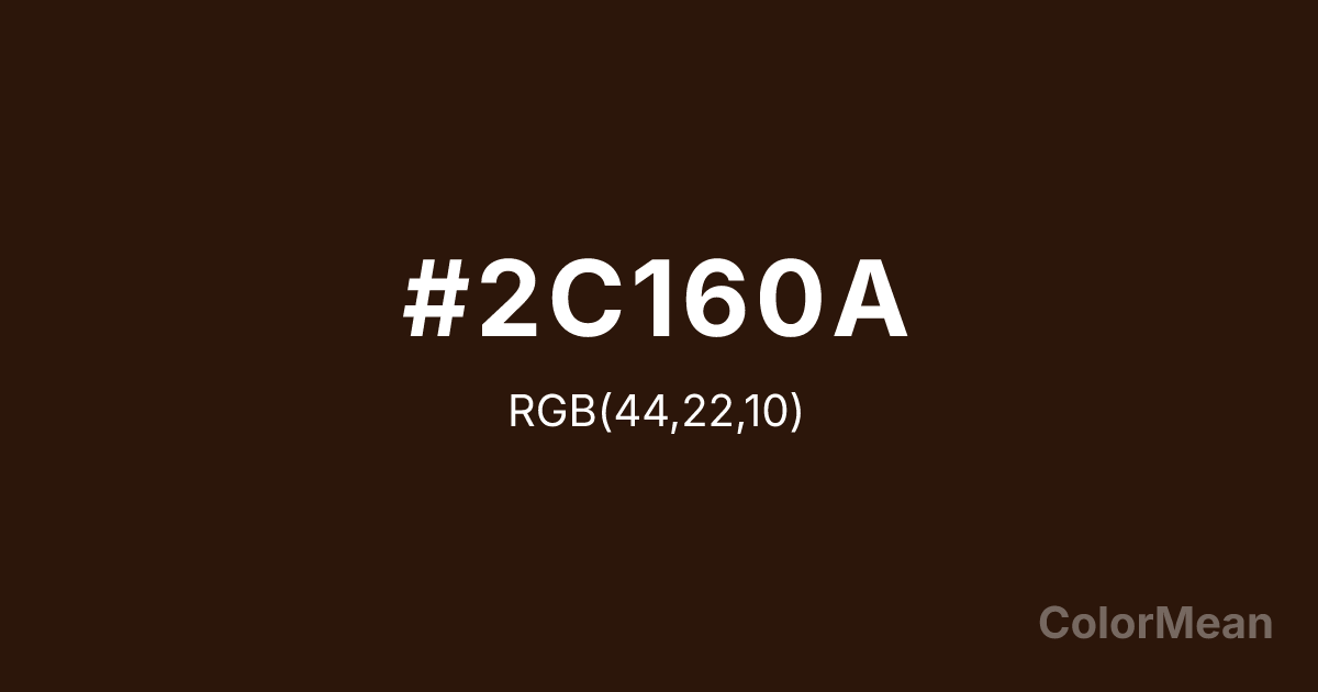 #2C160A RGB value is (44, 22, 10). The hex color red value is 44, green is 22, and blue is 10. Its HSL format shows a hue of 21°, saturation of 63 percent, and lightness of 11 percent. The CMYK process values are 0 percent, 50 percent, 77 percent, 83 percent.