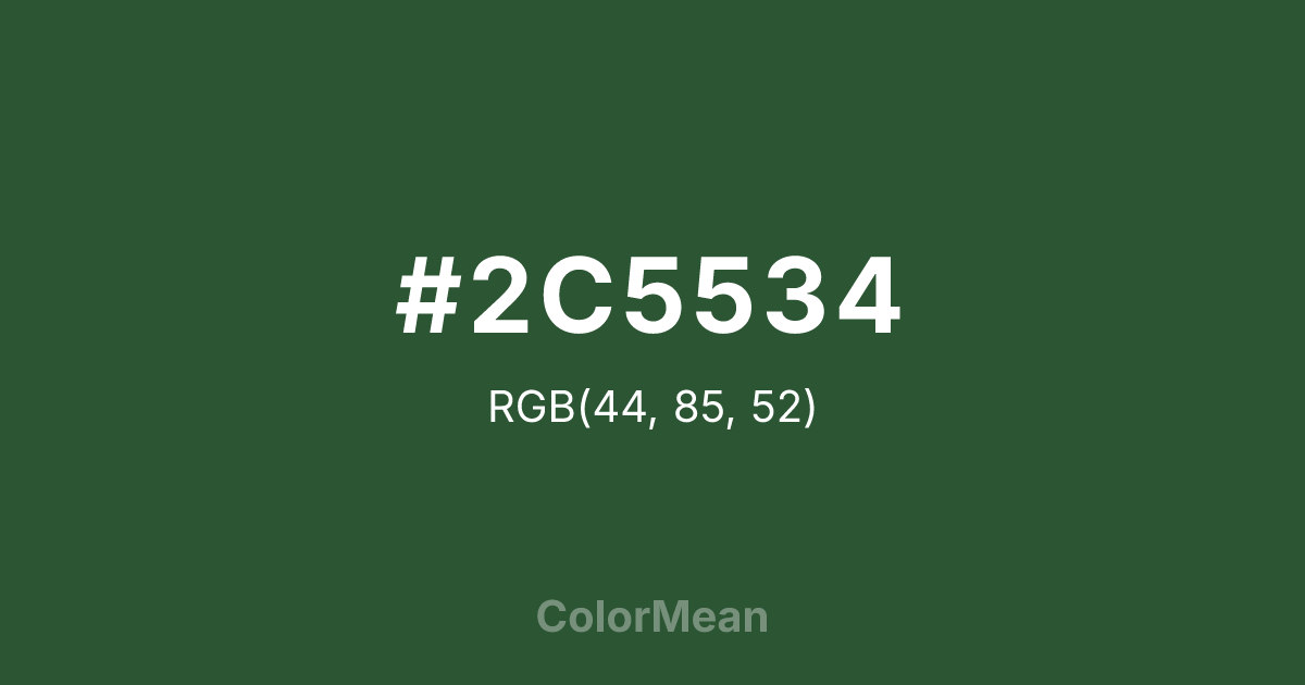 #2C5534 RGB value is (44, 85, 52). The hex color red value is 44, green is 85, and blue is 52. Its HSL format shows a hue of 132°, saturation of 32 percent, and lightness of 25 percent. The CMYK process values are 48 percent, 0 percent, 39 percent, 67 percent.
