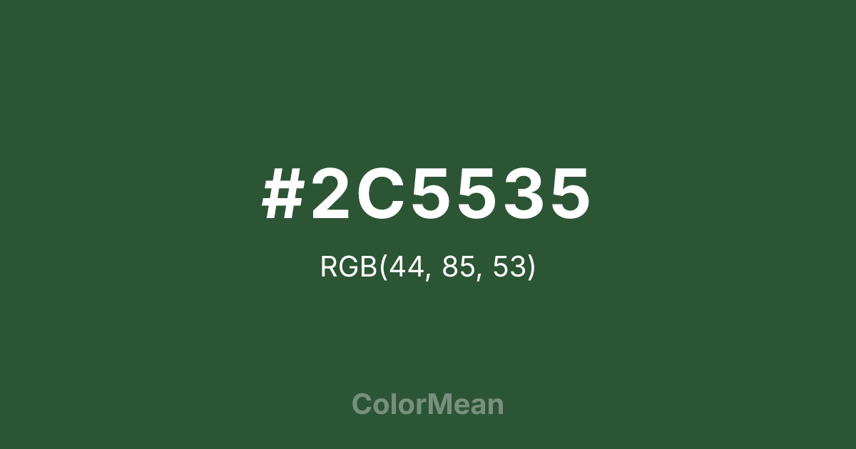 #2C5535 RGB value is (44, 85, 53). The hex color red value is 44, green is 85, and blue is 53. Its HSL format shows a hue of 133°, saturation of 32 percent, and lightness of 25 percent. The CMYK process values are 48 percent, 0 percent, 38 percent, 67 percent.