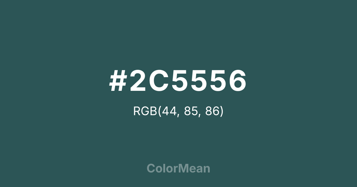 #2C5556 RGB value is (44, 85, 86). The hex color red value is 44, green is 85, and blue is 86. Its HSL format shows a hue of 181°, saturation of 32 percent, and lightness of 25 percent. The CMYK process values are 49 percent, 1 percent, 0 percent, 66 percent.