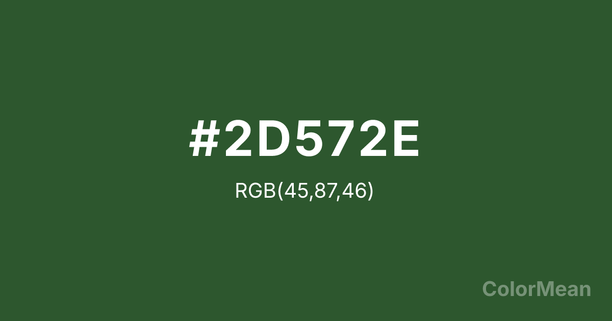 #2D572E RGB value is (45, 87, 46). The hex color red value is 45, green is 87, and blue is 46. Its HSL format shows a hue of 121°, saturation of 32 percent, and lightness of 26 percent. The CMYK process values are 48 percent, 0 percent, 47 percent, 66 percent.