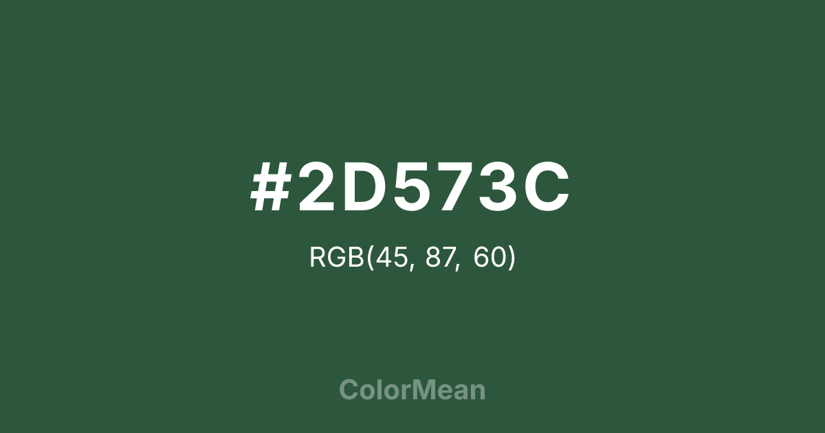 #2D573C RGB value is (45, 87, 60). The hex color red value is 45, green is 87, and blue is 60. Its HSL format shows a hue of 141°, saturation of 32 percent, and lightness of 26 percent. The CMYK process values are 48 percent, 0 percent, 31 percent, 66 percent.