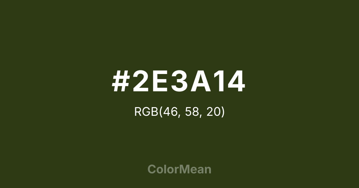 #2E3A14 RGB value is (46, 58, 20). The hex color red value is 46, green is 58, and blue is 20. Its HSL format shows a hue of 79°, saturation of 49 percent, and lightness of 15 percent. The CMYK process values are 21 percent, 0 percent, 66 percent, 77 percent.