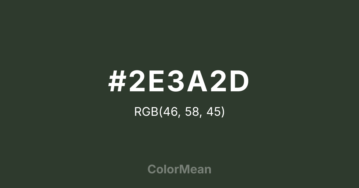 #2E3A2D RGB value is (46, 58, 45). The hex color red value is 46, green is 58, and blue is 45. Its HSL format shows a hue of 115°, saturation of 13 percent, and lightness of 20 percent. The CMYK process values are 21 percent, 0 percent, 22 percent, 77 percent.