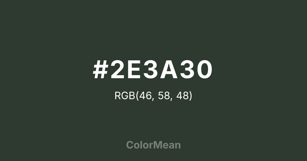 #2E3A30 RGB value is (46, 58, 48). The hex color red value is 46, green is 58, and blue is 48. Its HSL format shows a hue of 130°, saturation of 12 percent, and lightness of 20 percent. The CMYK process values are 21 percent, 0 percent, 17 percent, 77 percent.