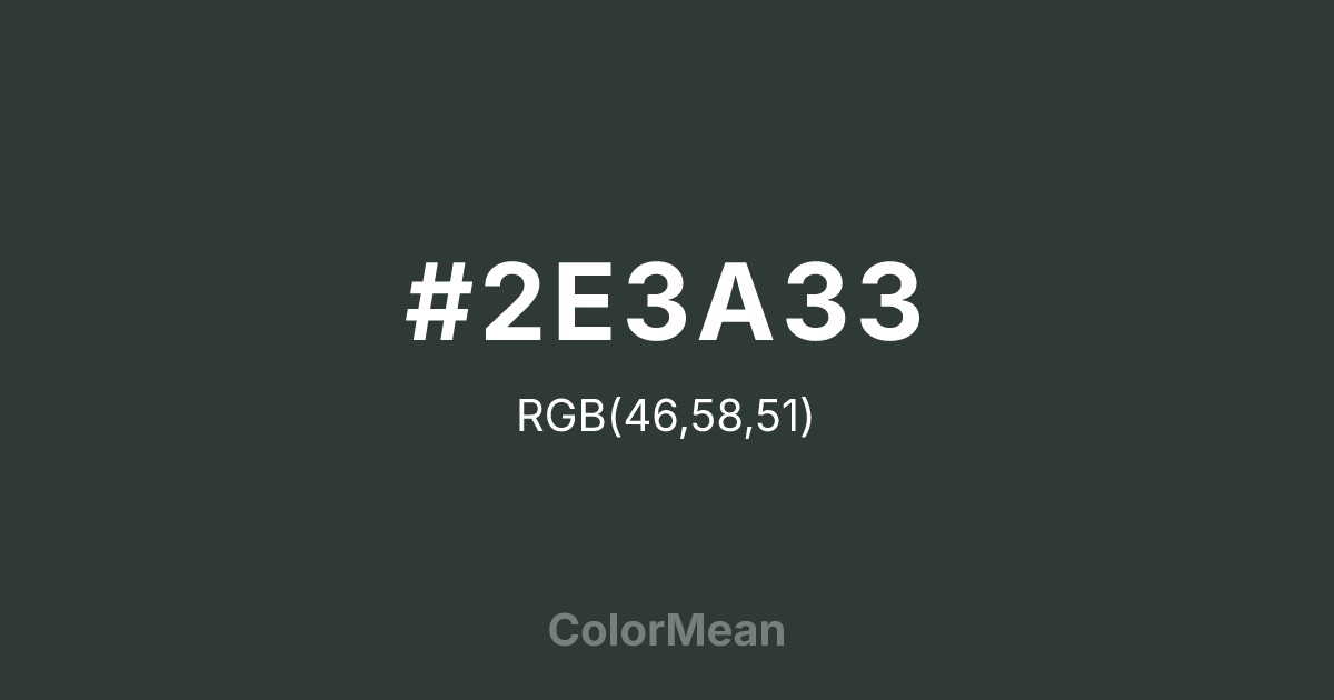 #2E3A33 RGB value is (46, 58, 51). The hex color red value is 46, green is 58, and blue is 51. Its HSL format shows a hue of 145°, saturation of 12 percent, and lightness of 20 percent. The CMYK process values are 21 percent, 0 percent, 12 percent, 77 percent.