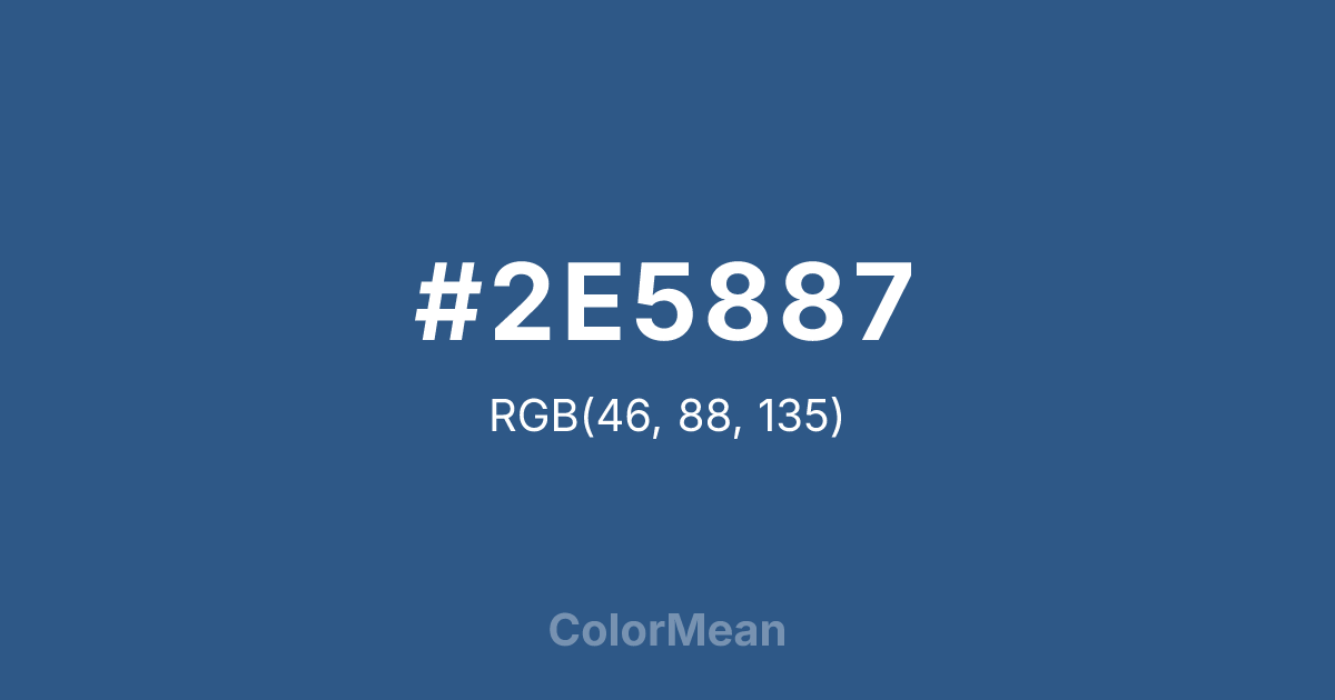 #2E5887 RGB value is (46, 88, 135). The hex color red value is 46, green is 88, and blue is 135. Its HSL format shows a hue of 212°, saturation of 49 percent, and lightness of 35 percent. The CMYK process values are 66 percent, 35 percent, 0 percent, 47 percent.