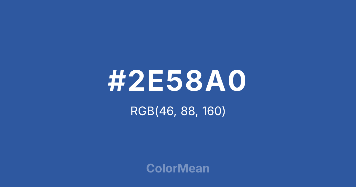 #2E58A0 RGB value is (46, 88, 160). The hex color red value is 46, green is 88, and blue is 160. Its HSL format shows a hue of 218°, saturation of 55 percent, and lightness of 40 percent. The CMYK process values are 71 percent, 45 percent, 0 percent, 37 percent.
