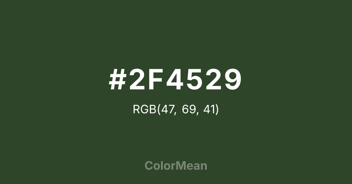 #2F4529 RGB value is (47, 69, 41). The hex color red value is 47, green is 69, and blue is 41. Its HSL format shows a hue of 107°, saturation of 25 percent, and lightness of 22 percent. The CMYK process values are 32 percent, 0 percent, 41 percent, 73 percent.