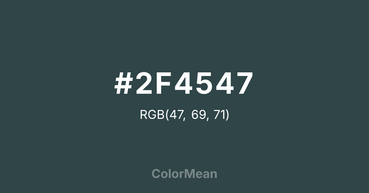 #2F4547 RGB value is (47, 69, 71). The hex color red value is 47, green is 69, and blue is 71. Its HSL format shows a hue of 185°, saturation of 20 percent, and lightness of 23 percent. The CMYK process values are 34 percent, 3 percent, 0 percent, 72 percent.