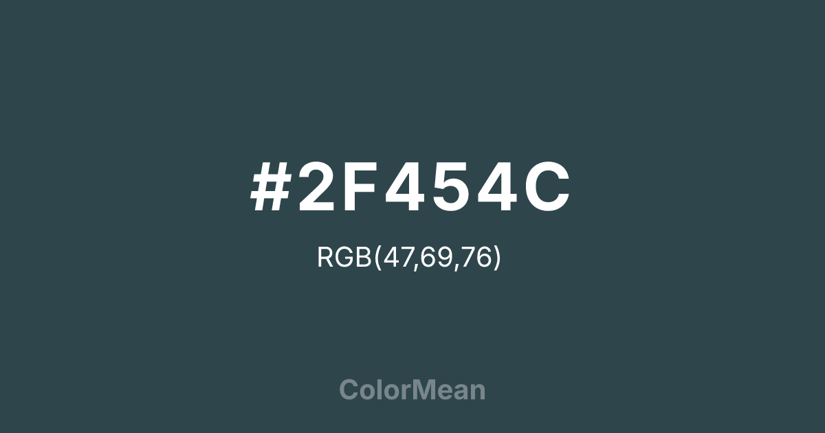 #2F454C RGB value is (47, 69, 76). The hex color red value is 47, green is 69, and blue is 76. Its HSL format shows a hue of 194°, saturation of 24 percent, and lightness of 24 percent. The CMYK process values are 38 percent, 9 percent, 0 percent, 70 percent.