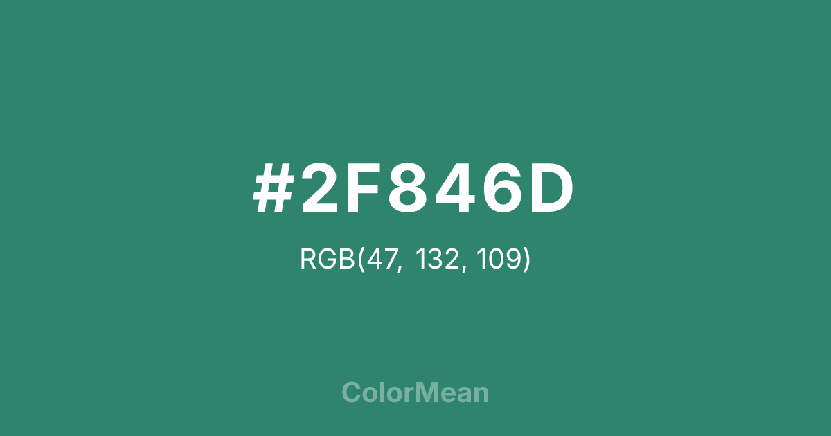 #2F846D RGB value is (47, 132, 109). The hex color red value is 47, green is 132, and blue is 109. Its HSL format shows a hue of 164°, saturation of 47 percent, and lightness of 35 percent. The CMYK process values are 64 percent, 0 percent, 17 percent, 48 percent.