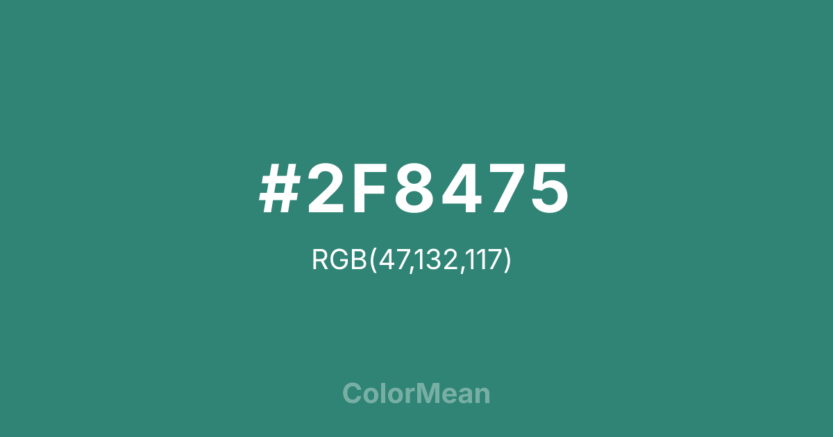 #2F8475 RGB value is (47, 132, 117). The hex color red value is 47, green is 132, and blue is 117. Its HSL format shows a hue of 169°, saturation of 47 percent, and lightness of 35 percent. The CMYK process values are 64 percent, 0 percent, 11 percent, 48 percent.