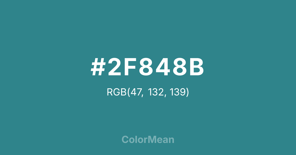 #2F848B RGB value is (47, 132, 139). The hex color red value is 47, green is 132, and blue is 139. Its HSL format shows a hue of 185°, saturation of 49 percent, and lightness of 36 percent. The CMYK process values are 66 percent, 5 percent, 0 percent, 45 percent.