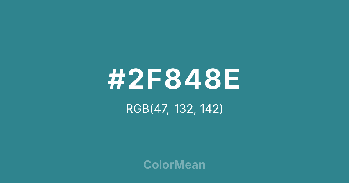#2F848E RGB value is (47, 132, 142). The hex color red value is 47, green is 132, and blue is 142. Its HSL format shows a hue of 186°, saturation of 50 percent, and lightness of 37 percent. The CMYK process values are 67 percent, 7 percent, 0 percent, 44 percent.