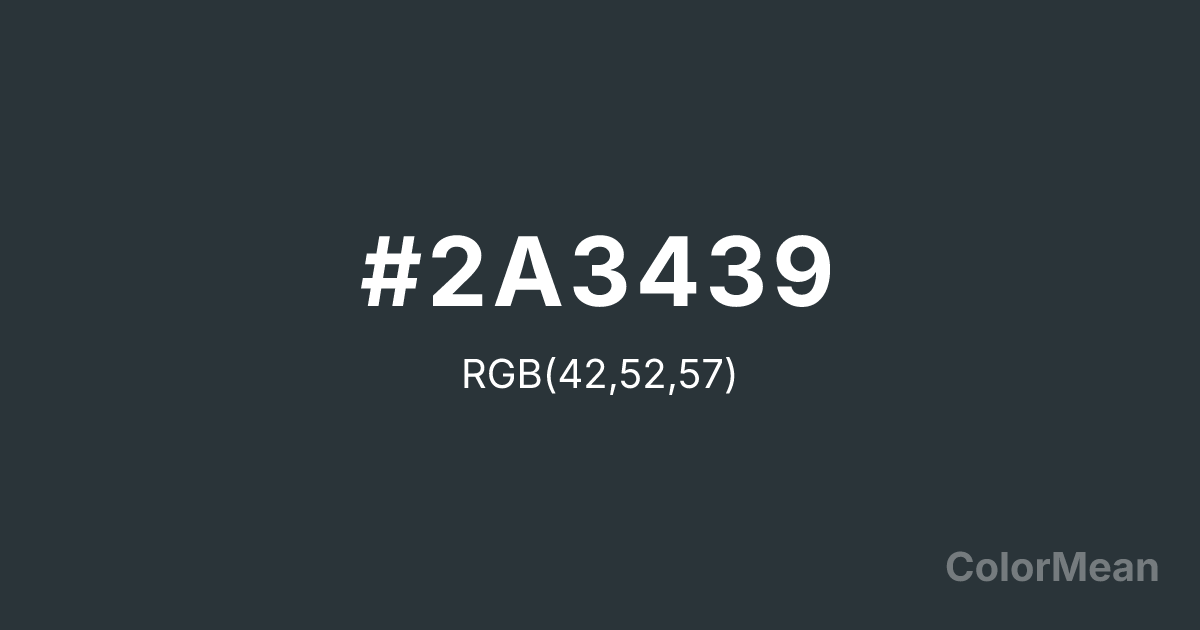 Gunmetal (#2A3439) RGB value is (42, 52, 57). The hex color red value is 42, green is 52, and blue is 57. Its HSL format shows a hue of 200°, saturation of 15 percent, and lightness of 19 percent. The CMYK process values are 26 percent, 9 percent, 0 percent, 78 percent.