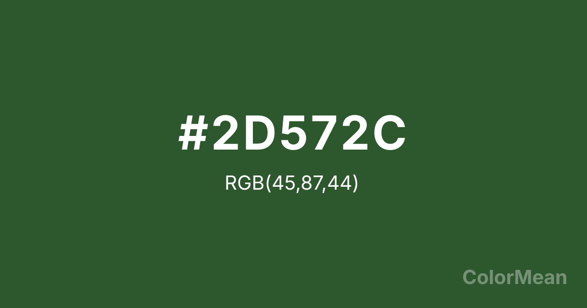 Leaf Green (#2D572C) RGB value is (45, 87, 44). The hex color red value is 45, green is 87, and blue is 44. Its HSL format shows a hue of 119°, saturation of 33 percent, and lightness of 26 percent. The CMYK process values are 48 percent, 0 percent, 49 percent, 66 percent.