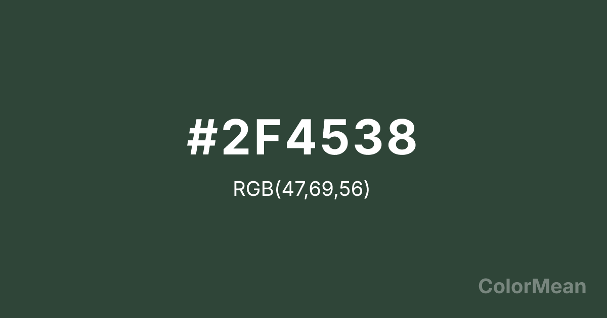 Moss Green (#2F4538) RGB value is (47, 69, 56). The hex color red value is 47, green is 69, and blue is 56. Its HSL format shows a hue of 145°, saturation of 19 percent, and lightness of 23 percent. The CMYK process values are 32 percent, 0 percent, 19 percent, 73 percent.