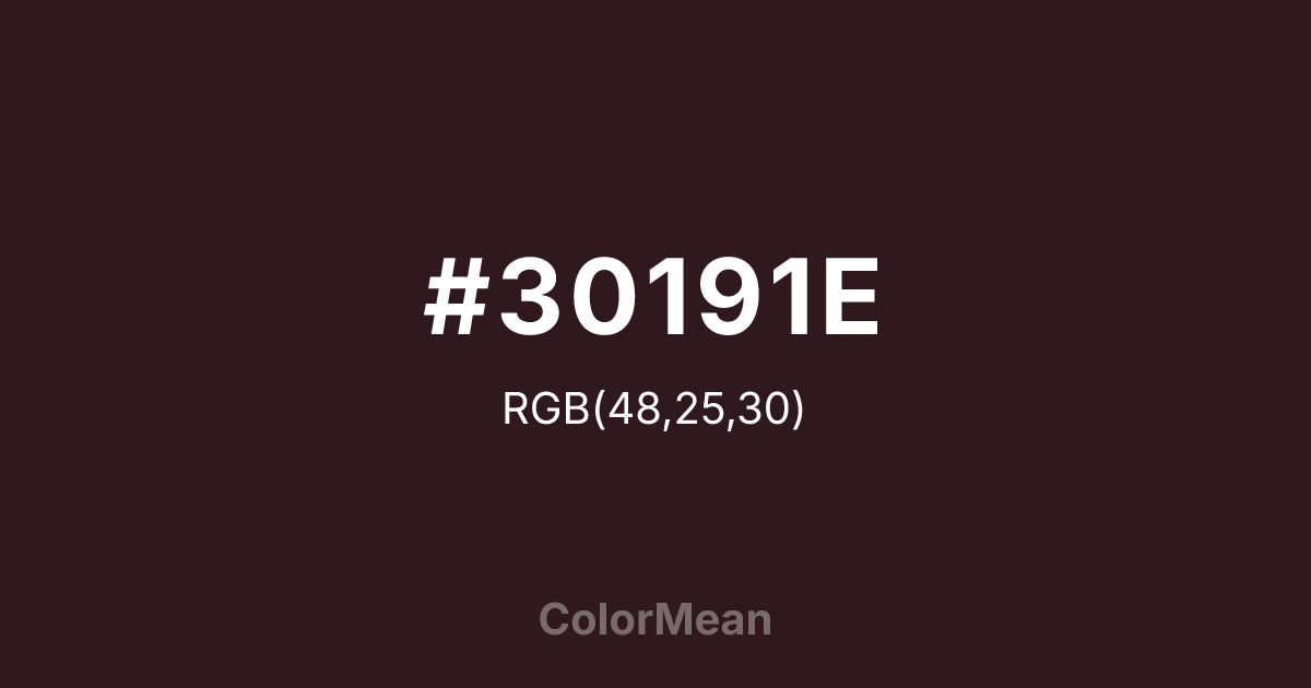 #30191E RGB value is (48, 25, 30). The hex color red value is 48, green is 25, and blue is 30. Its HSL format shows a hue of 347°, saturation of 32 percent, and lightness of 14 percent. The CMYK process values are 0 percent, 48 percent, 37 percent, 81 percent.