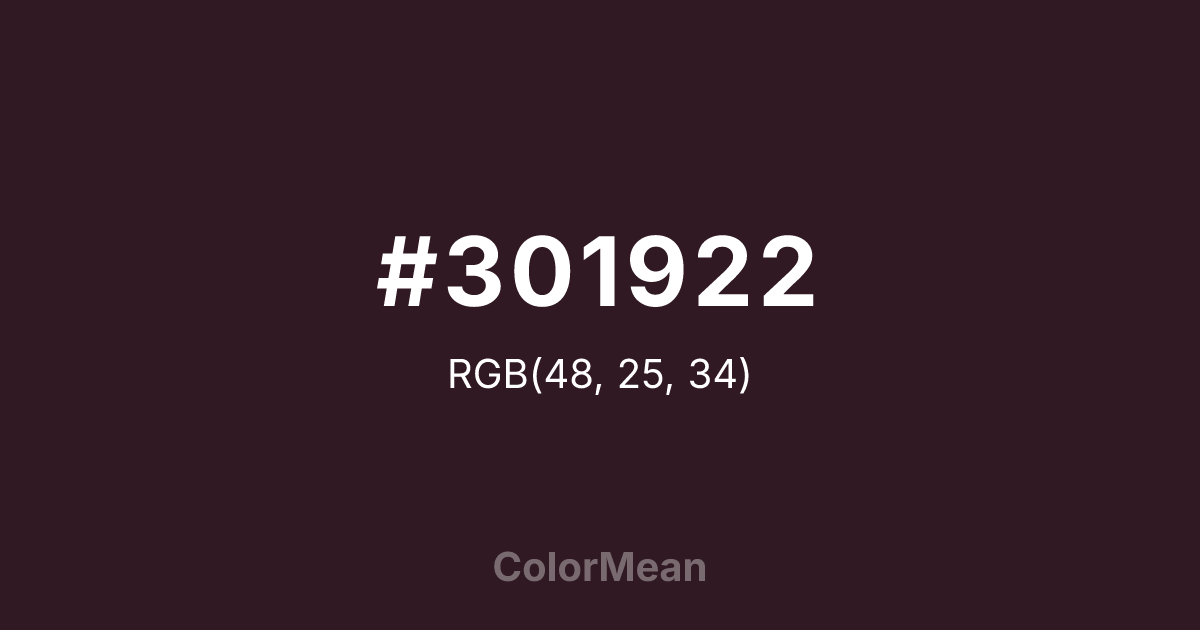 #301922 RGB value is (48, 25, 34). The hex color red value is 48, green is 25, and blue is 34. Its HSL format shows a hue of 337°, saturation of 32 percent, and lightness of 14 percent. The CMYK process values are 0 percent, 48 percent, 29 percent, 81 percent.