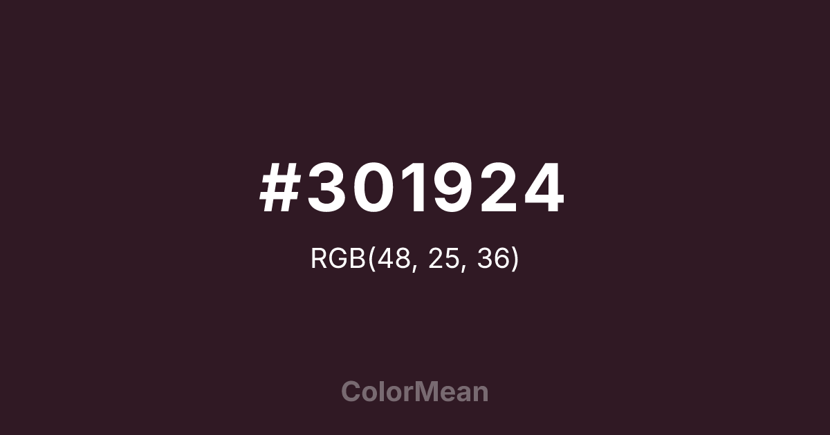 #301924 RGB value is (48, 25, 36). The hex color red value is 48, green is 25, and blue is 36. Its HSL format shows a hue of 331°, saturation of 32 percent, and lightness of 14 percent. The CMYK process values are 0 percent, 48 percent, 25 percent, 81 percent.