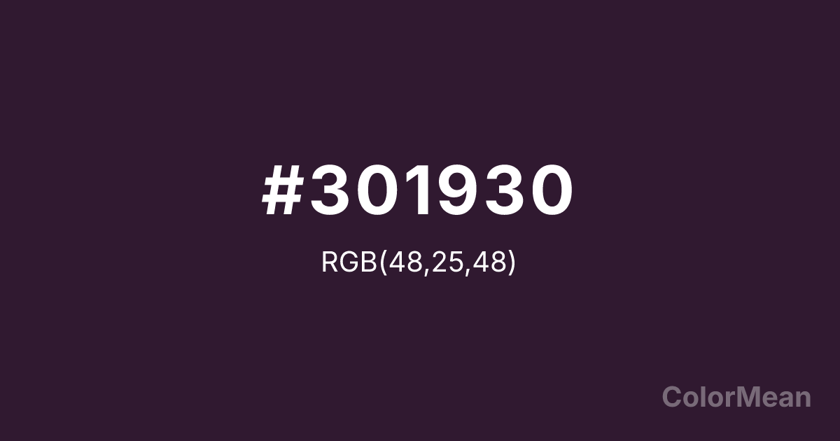 #301930 RGB value is (48, 25, 48). The hex color red value is 48, green is 25, and blue is 48. Its HSL format shows a hue of 300°, saturation of 32 percent, and lightness of 14 percent. The CMYK process values are 0 percent, 48 percent, 0 percent, 81 percent.