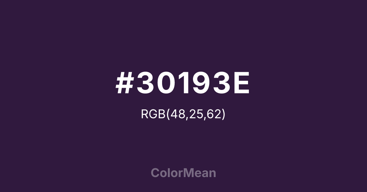 #30193E RGB value is (48, 25, 62). The hex color red value is 48, green is 25, and blue is 62. Its HSL format shows a hue of 277°, saturation of 43 percent, and lightness of 17 percent. The CMYK process values are 23 percent, 60 percent, 0 percent, 76 percent.