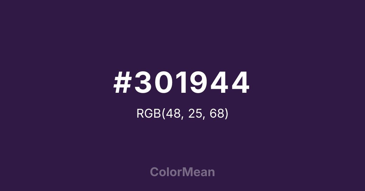 #301944 RGB value is (48, 25, 68). The hex color red value is 48, green is 25, and blue is 68. Its HSL format shows a hue of 272°, saturation of 46 percent, and lightness of 18 percent. The CMYK process values are 29 percent, 63 percent, 0 percent, 73 percent.