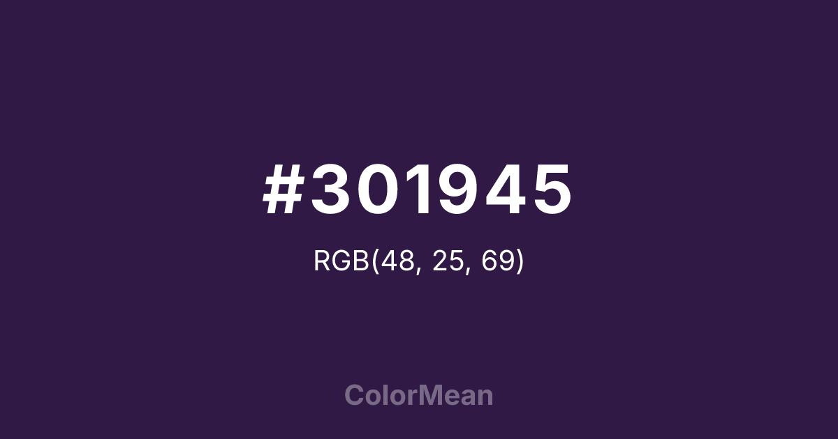 #301945 RGB value is (48, 25, 69). The hex color red value is 48, green is 25, and blue is 69. Its HSL format shows a hue of 271°, saturation of 47 percent, and lightness of 18 percent. The CMYK process values are 30 percent, 64 percent, 0 percent, 73 percent.