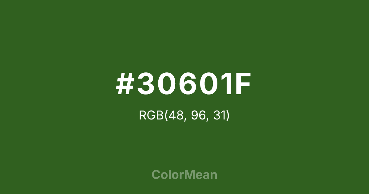 #30601F RGB value is (48, 96, 31). The hex color red value is 48, green is 96, and blue is 31. Its HSL format shows a hue of 104°, saturation of 51 percent, and lightness of 25 percent. The CMYK process values are 50 percent, 0 percent, 68 percent, 62 percent.