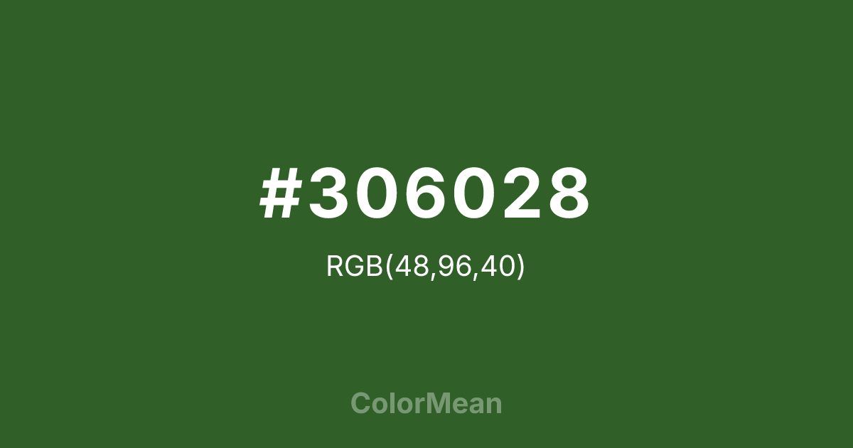 #306028 RGB value is (48, 96, 40). The hex color red value is 48, green is 96, and blue is 40. Its HSL format shows a hue of 111°, saturation of 41 percent, and lightness of 27 percent. The CMYK process values are 50 percent, 0 percent, 58 percent, 62 percent.